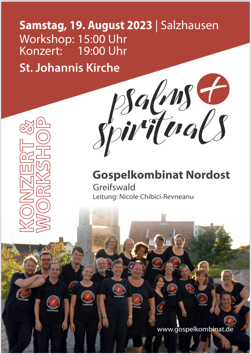Auf seiner Konzertreise in die Lüneburger Heide ist am 19. und 20. August das Gospelkombinat Nordost bei uns zu Gast. Am Samstag, den 19. August sind interessierte Sängerinnen und Sänger zu einem gemeinsamen Workshop eingeladen, der von 15 -17 Uhr im Gemeindehaus Salzhausen stattfindet. Um 19 Uhr gibt das Gospelkombinat ein Konzert in der St. Johanniskirche. Am Sonntag gestalten Chor und Workshopteilnehmer gemeinsam den Gottesdienst um 10 Uhr, ebenfalls in der Kirche in Salzhausen.