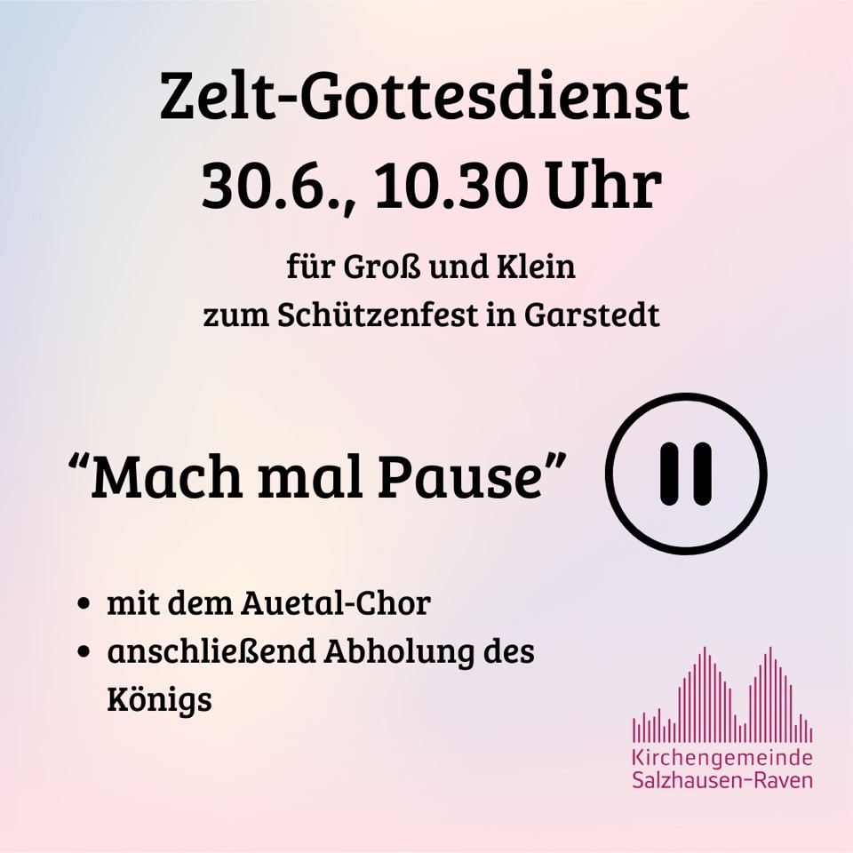 Es ist schon lange Tradition: Am 30. Juni findet um 10.30 Uhr in Garstedt der Zeltgottesdienst auf dem Schützenplatz statt – abwechslungsreich und für alle Generationen. Mit dabei sind der Singkreis Auetal, Kinder aus der Gemeinde und natürlich die neuen Majestäten.