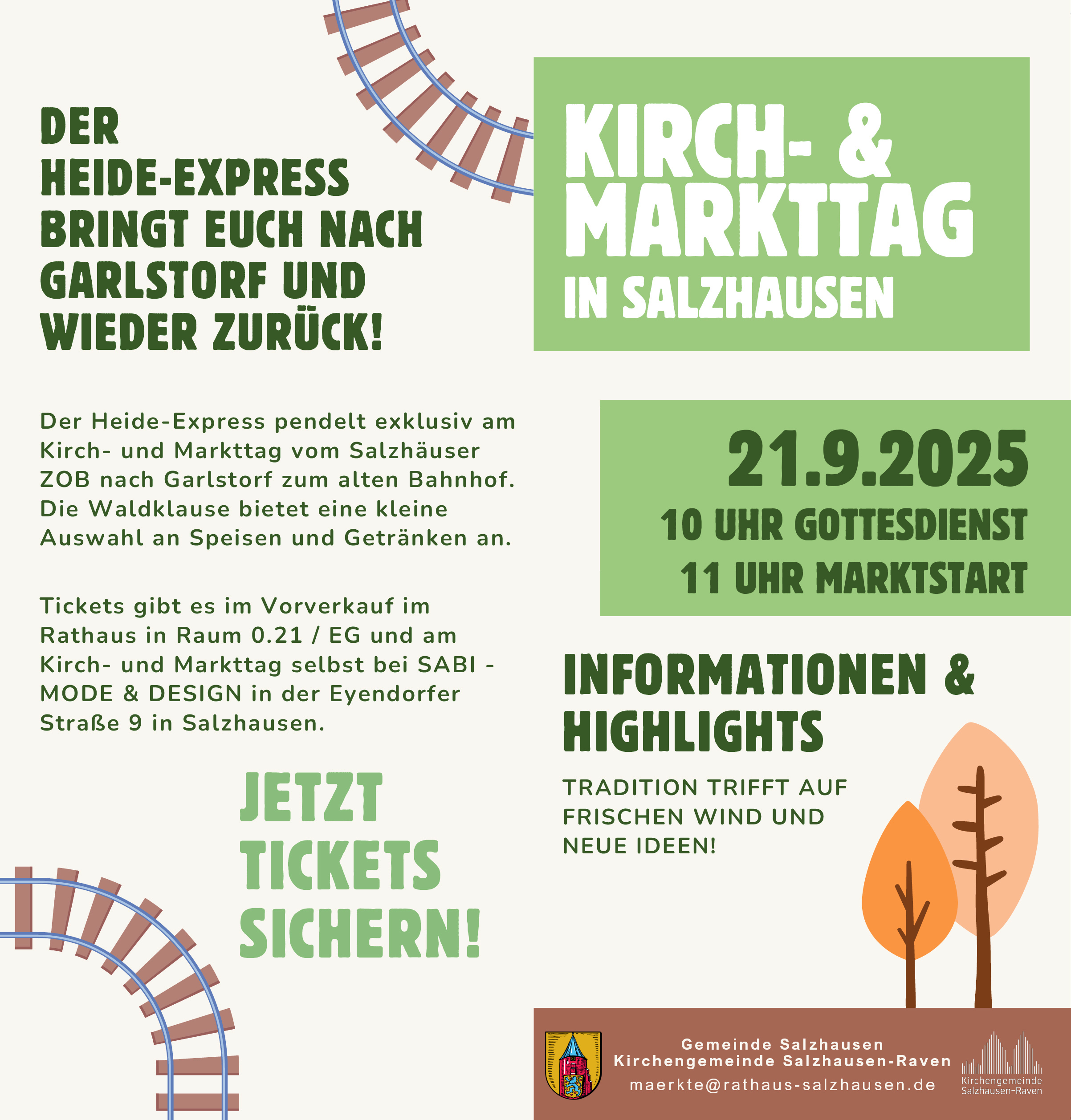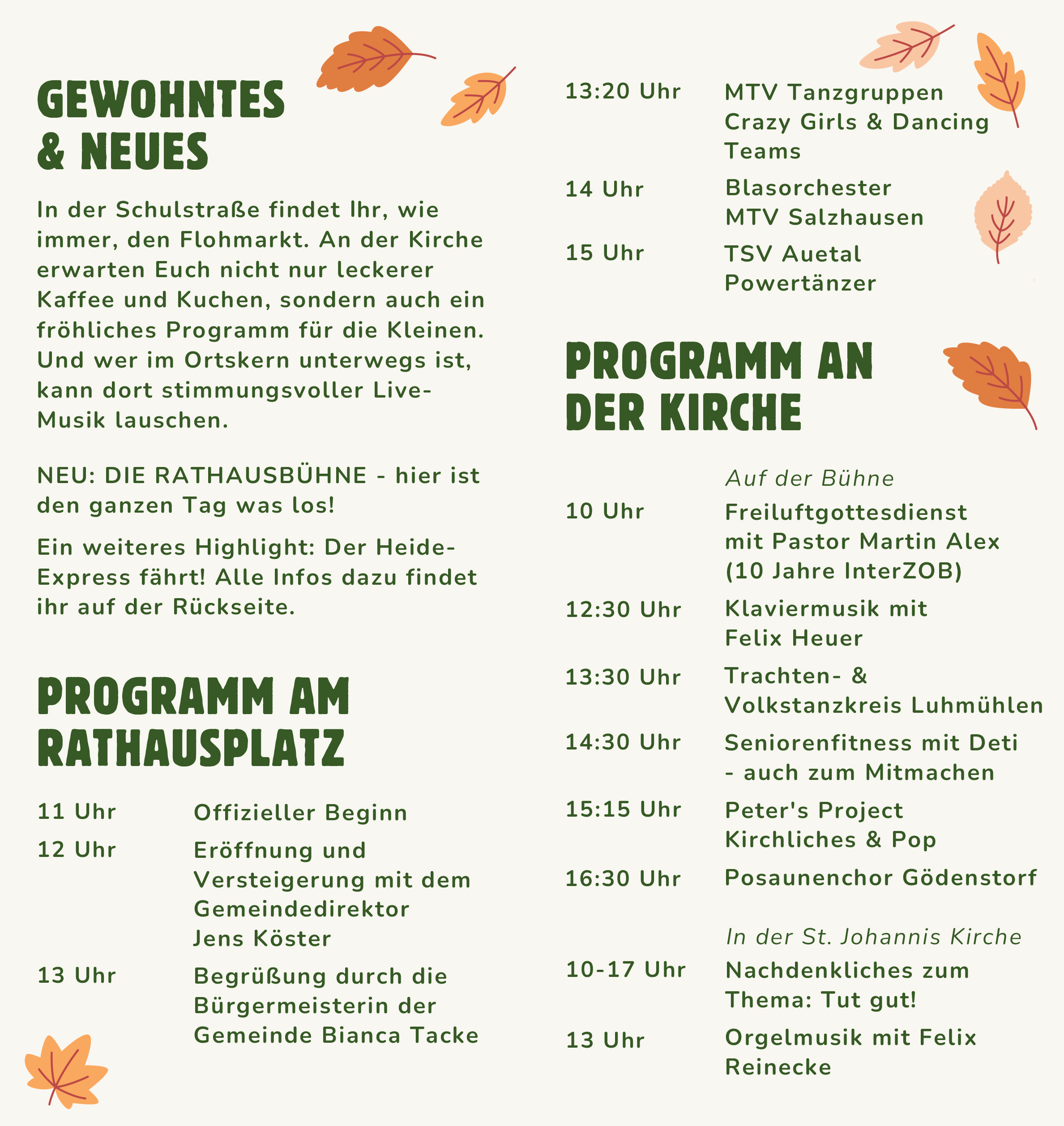 Neu ist in diesem Jahr die Rathausbühne mit der offiziellen Eröffnung um 11 Uhr, einer Versteigerung, Kindertanzen, dem Blasorchester und Tänzern. Viele verschiedene Stationen sind über das Dorf verteilt – u.a. der Flohmarkt in der Schulstraße, kulinarische Angebote, Live-Musik und vieles mehr. Und wer nicht über, sondern auch mal auf den Schienen von Salzhausen nach Garlstorf fahren will, kann dies mit dem Heide-Express von Bahnhof zu Bahnhof tun. Infos siehe Bilder.