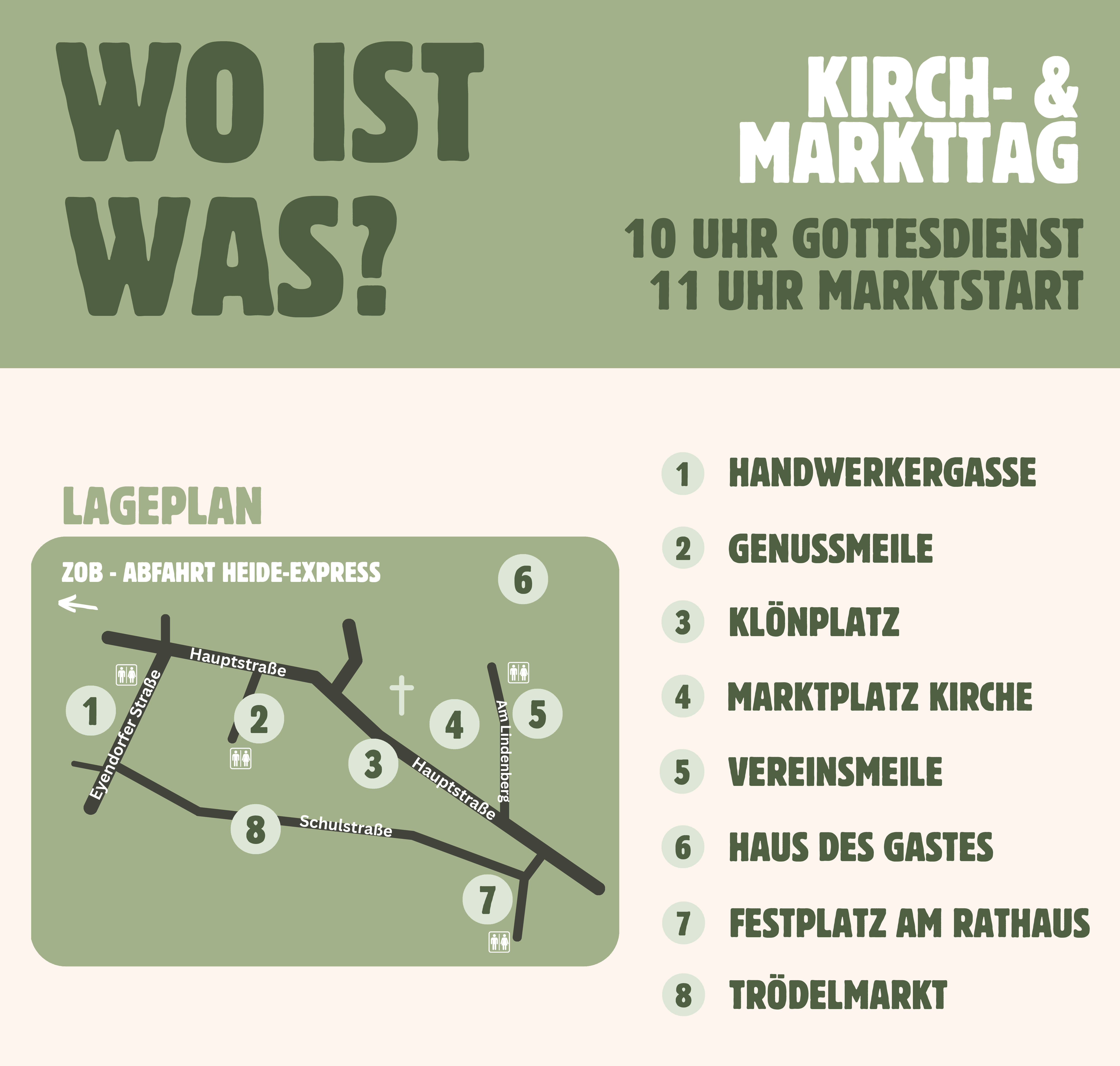 Auf der Bühne hinter der Kirche ist im Laufe des Tages Klaviermusik von Felix Heuer zu erleben, der Trachten- und Volkstanzkreis Luhmühlen, Seniorenfitness mit Deti, Musik von „Peter´s Project“ und der Posaunenchor Gödenstorf. Der „Marktplatz Kirche“ bietet darüber hinaus Kinderspiele, Pfadfinderjurte mit Stockbrot, Souveniers der Stiftungen, Infos der Ev. Gemeinschaft, sowie die durchgehend geöffnete Kirche.