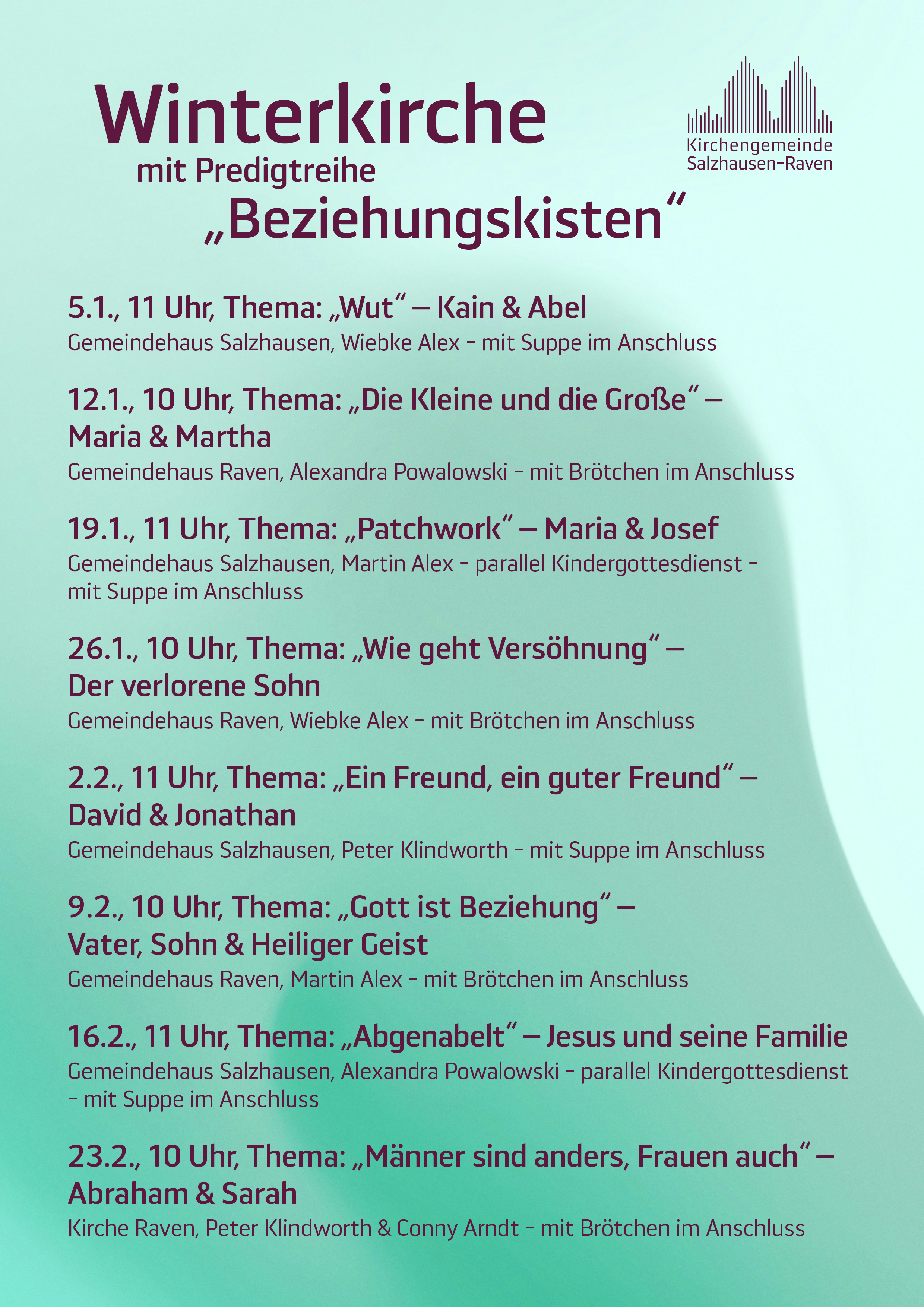 Die Winterkirche steht unter dem Thema "Beziehungskisten". An acht Sonntagen geht es um Themen aus dem Leben - inklusive biblischem Bezug. Nach den Gottesdiensten gibt es in Salzhausen eine warme Suppe und in Raven belegte Brötchen.