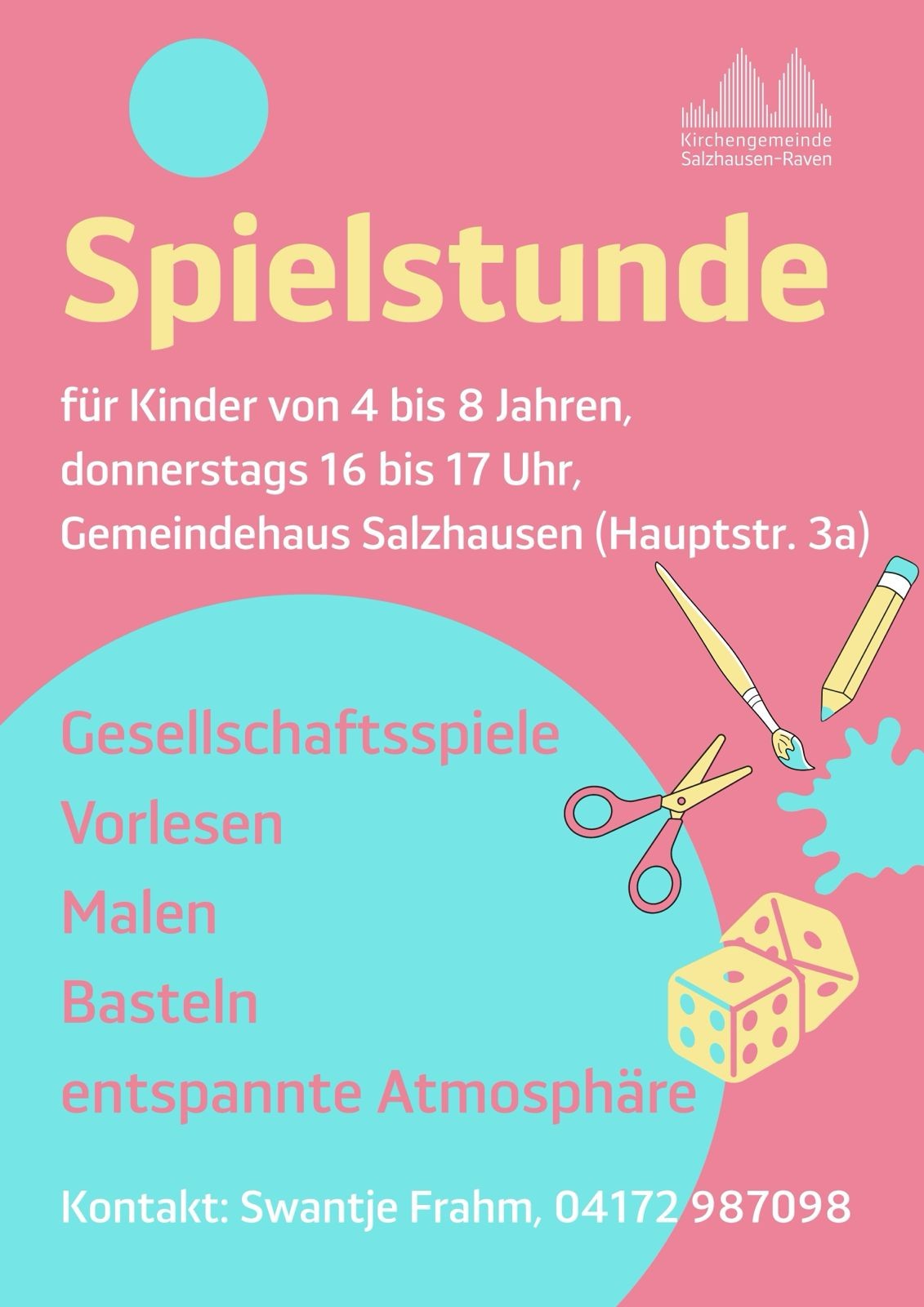 Die Spielstunde findet ab sofort von 16:00 - 17:00 Uhr im Gemeindehaus statt. Herzliche Einladung an alle 4- bis 8-jährigen.
